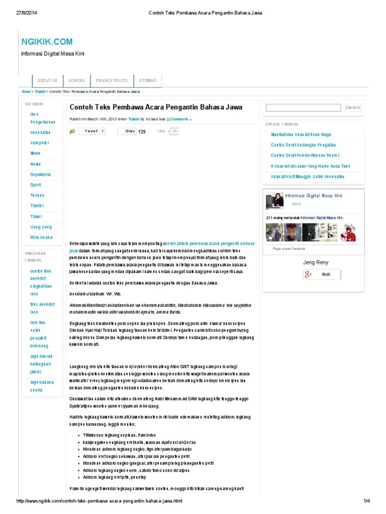 Contoh teks pembawa acara / mc acara tahlilan pengajian dalam bahasa jawa.deskripsi lengkap . Panduan lengkap menjadi mc profesioanal dan ahli pidato bahasa jawa pranatacara lan sesorah. Hampir setiap pernikahan jawa pastinya menggunakan bahasa jawa meskipun tidak sepenuhnya mulai dari awal hingga akhir acara. Contoh teks mc bahasa jawa pambuko mc manten part 1. Teks pembawa acara manten bahasa jawa.